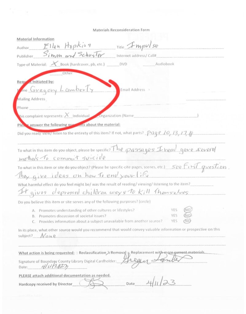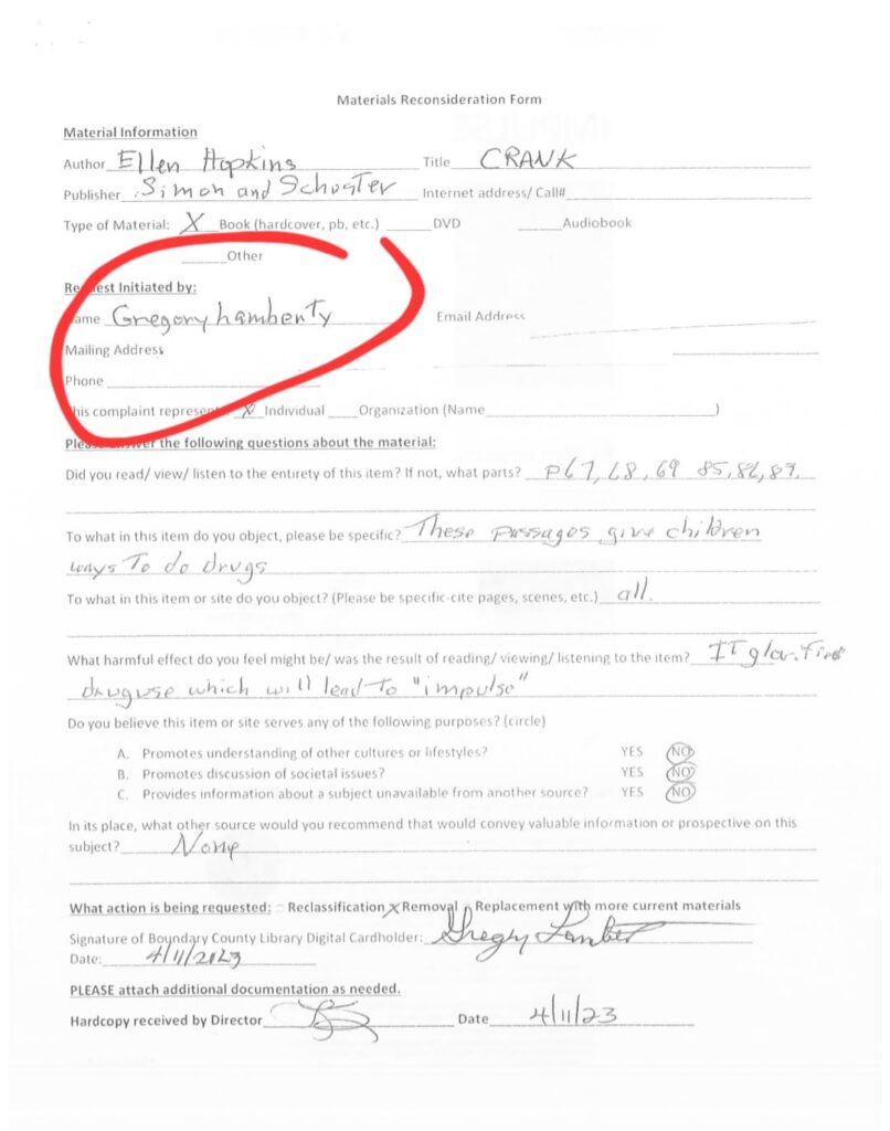 In the May 18, 2023 edition of Bonners Ferry Herald you wrote that I submitted Reconsideration Forms for three books (Crank, Perfect and Impulse).