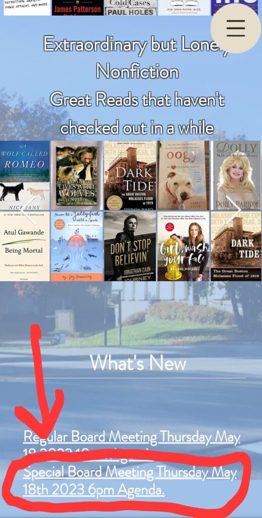 Click on Library website to see how easy it is to access the three (3) Reconsideration applications to verify who applied. Scroll to the bottom and click “Special Board Meeting Thursday May 18th 2023 6pm Agenda.”